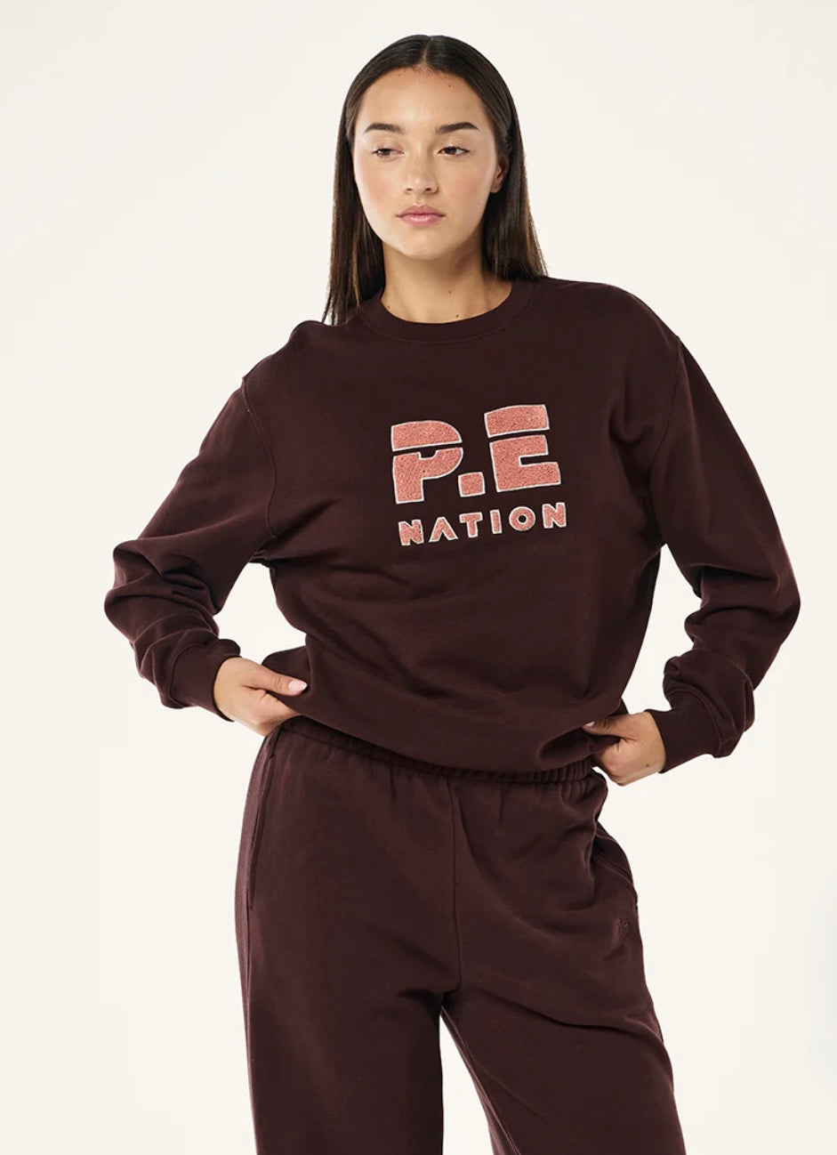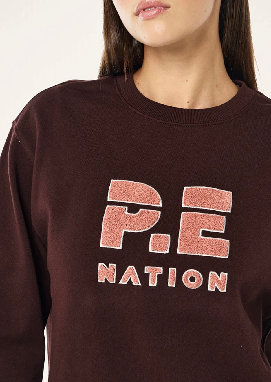P.E. NATION HEADS UP BOUCLE SWEAT IN MAHOGANY