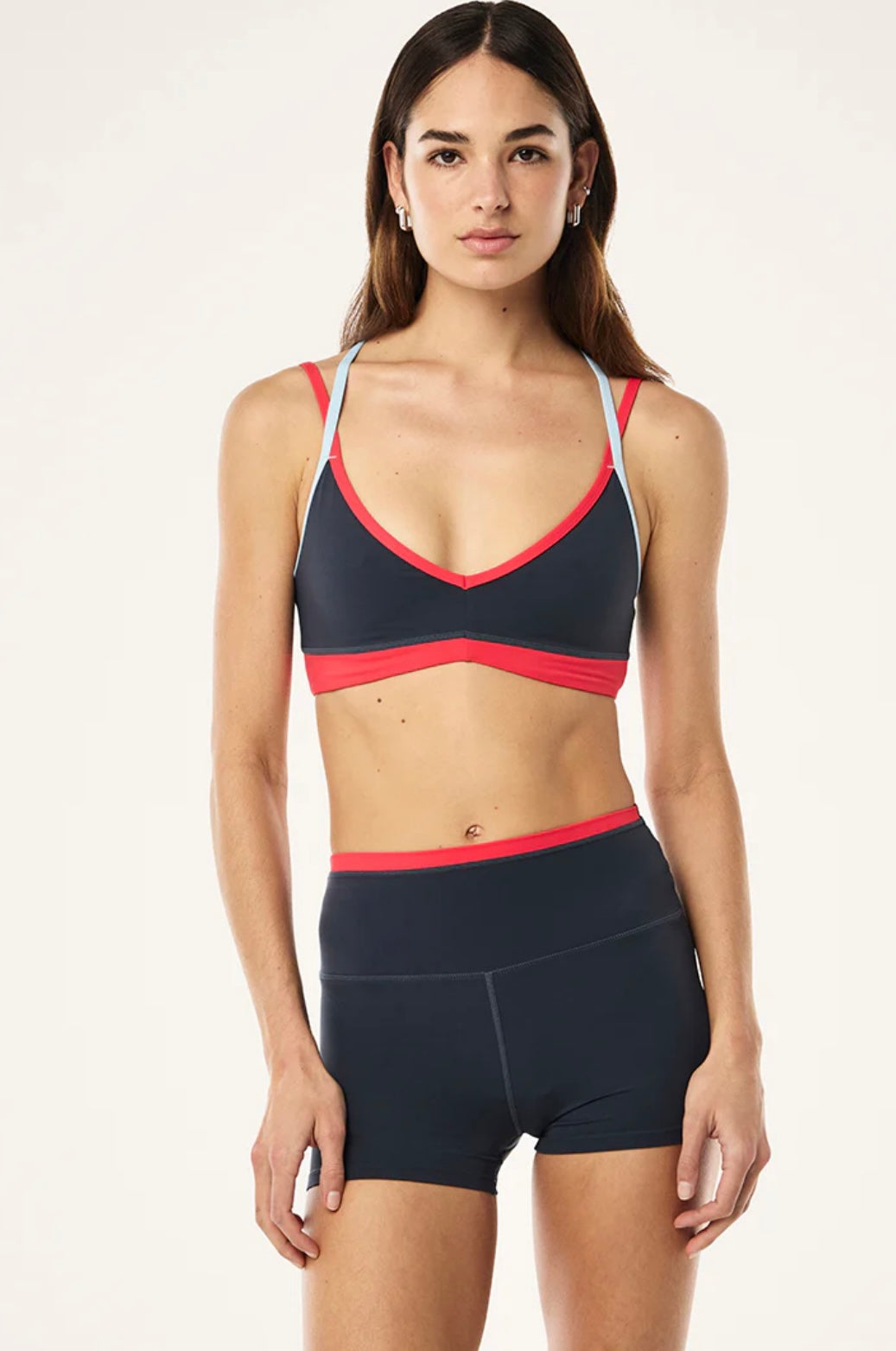 The Paramount Sports Bra in Marine Blue & Strawberry is perfectly designed in our signature Active Lite fabrication, our most lightweight active fabric, for all workout types. This active V-neck sports bra with contrasting panelling offers light compression and adjustable straps at back. Style this piece with the matching Vita Legging or Bikeshort to complete the set.